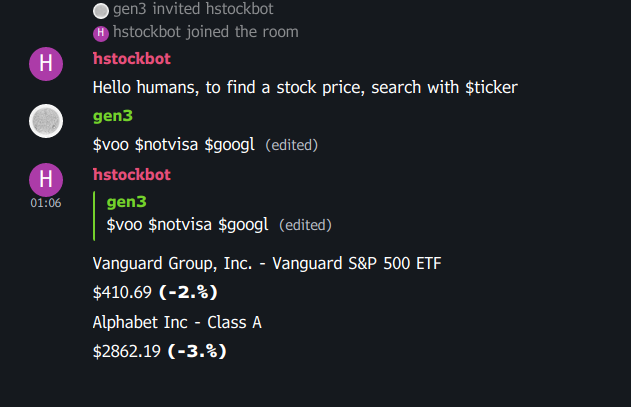 - Searches messages for $stocks mentioned, then formats and replies the current price and daily percent change for all the tickers in the message