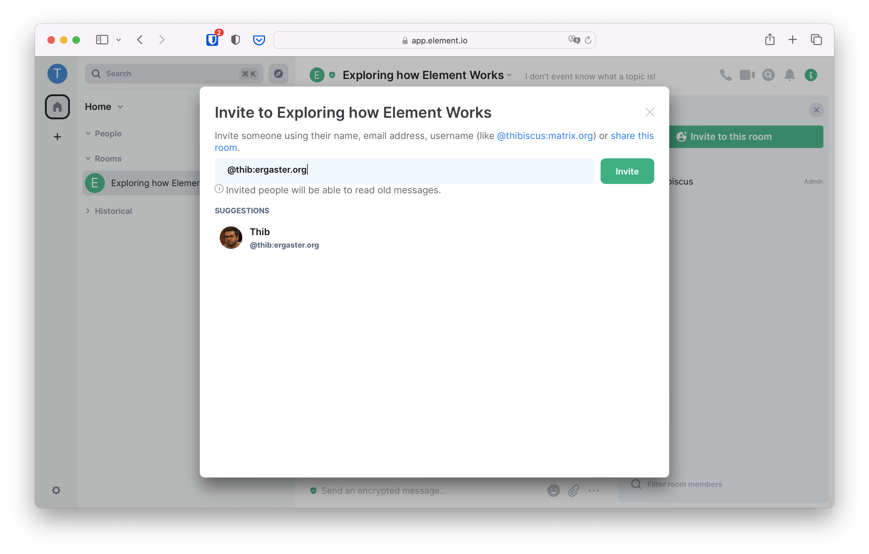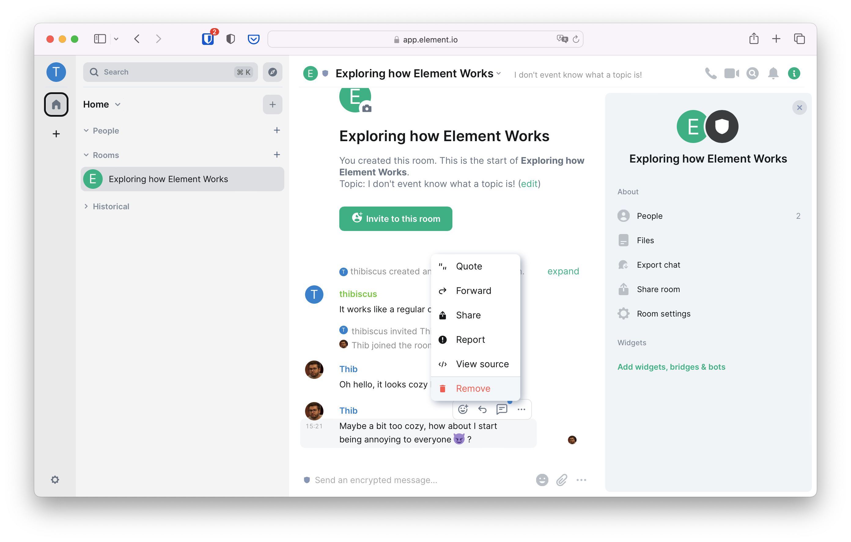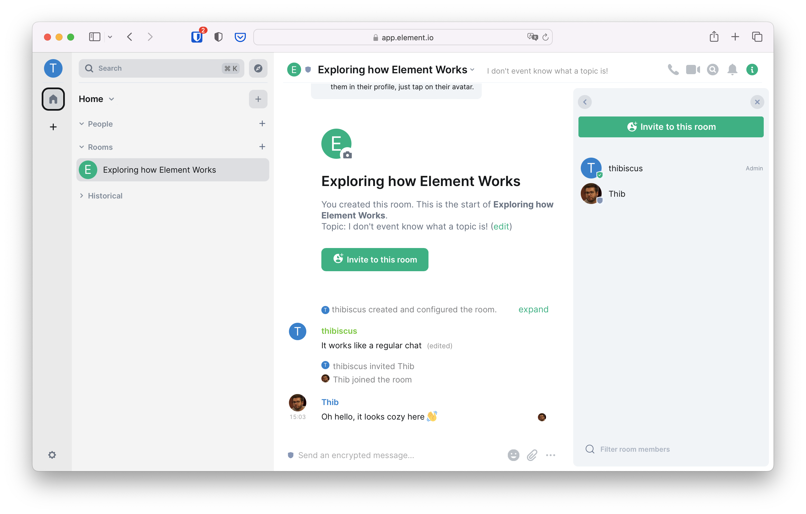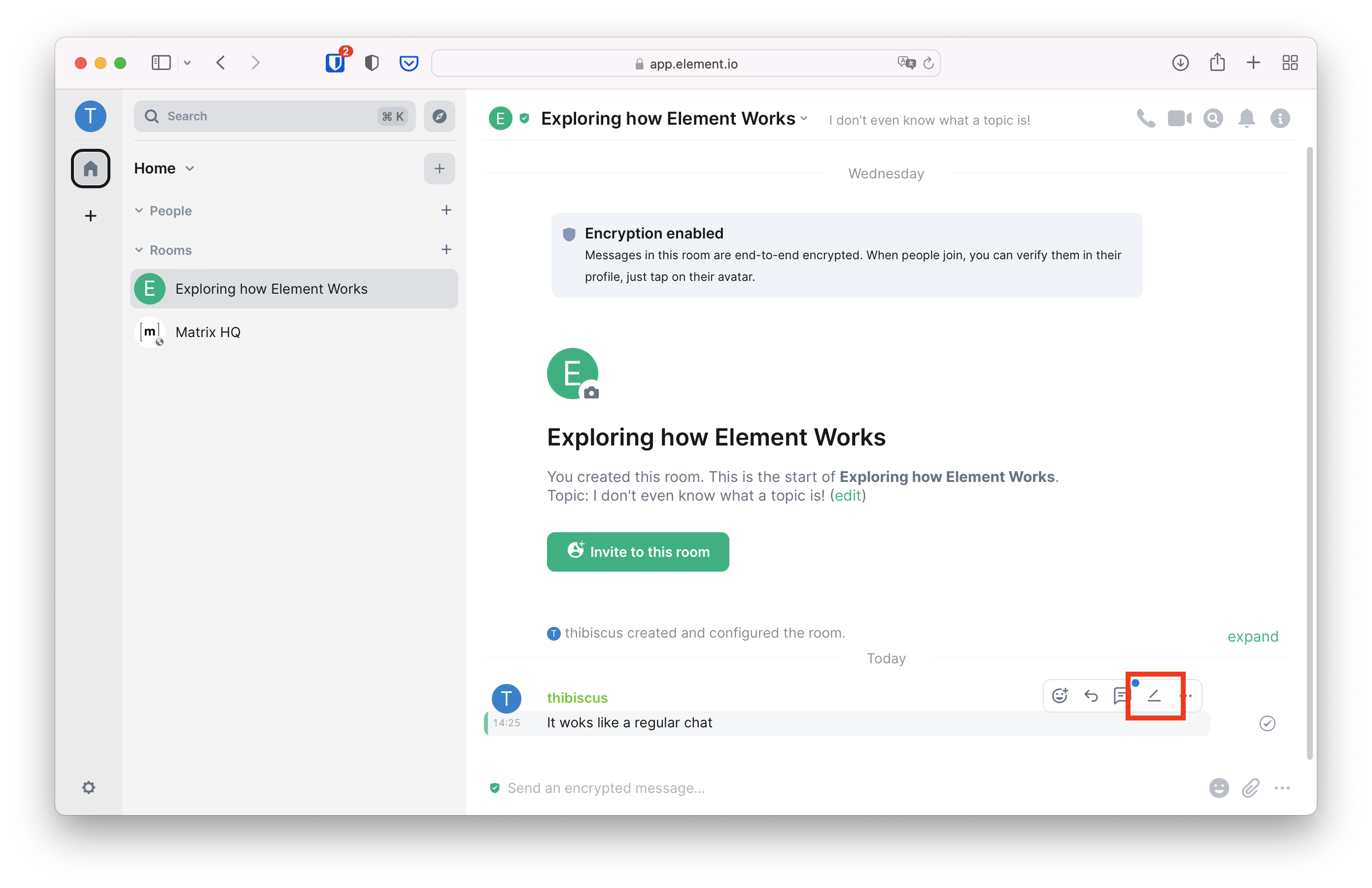 Voilà, you're in your own group chat! In the Matrix jargon, chats are called rooms. Let's give it a try immediately and type a message, then either press the return key or click on the send button.