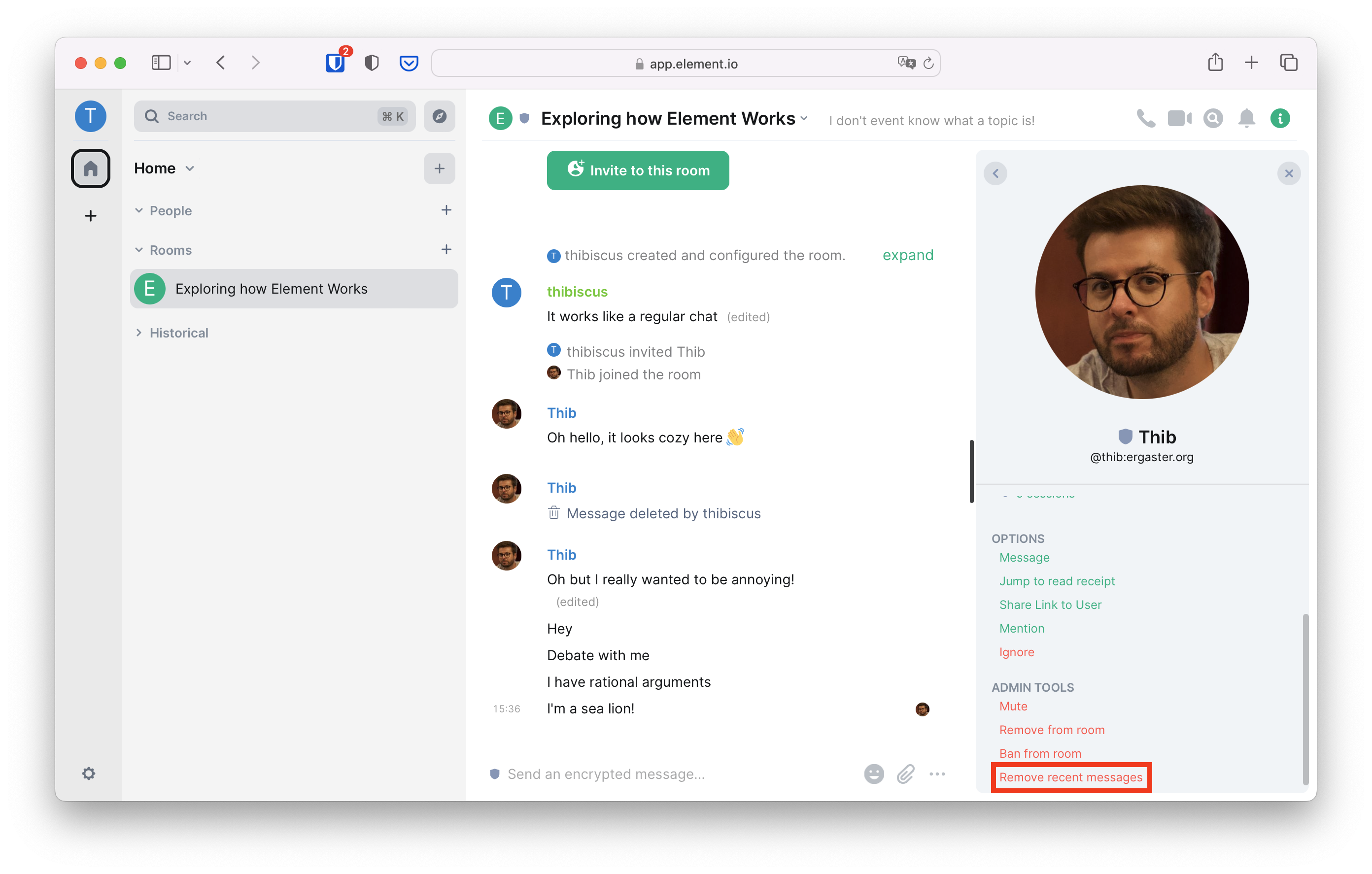But sometimes removing the messages is not enough, and the troublemaker doesn't want to be reasoned with. In such a case, you can remove them from the private group chat. To do so, click on their avatar in the timeline, scroll to the bottom of the right panel, and click on "Remove from room".