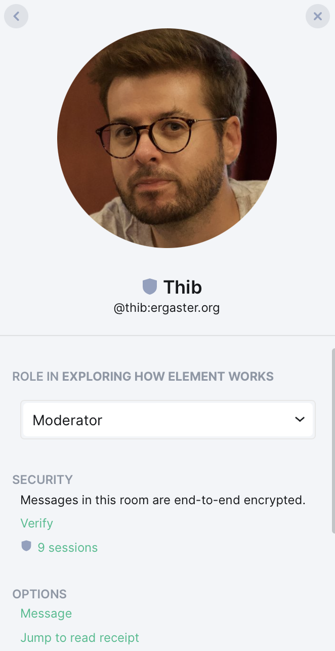 With the "Default" role, people can only participate in the conversation. Element defines two other roles: "Moderator" and "Admin".